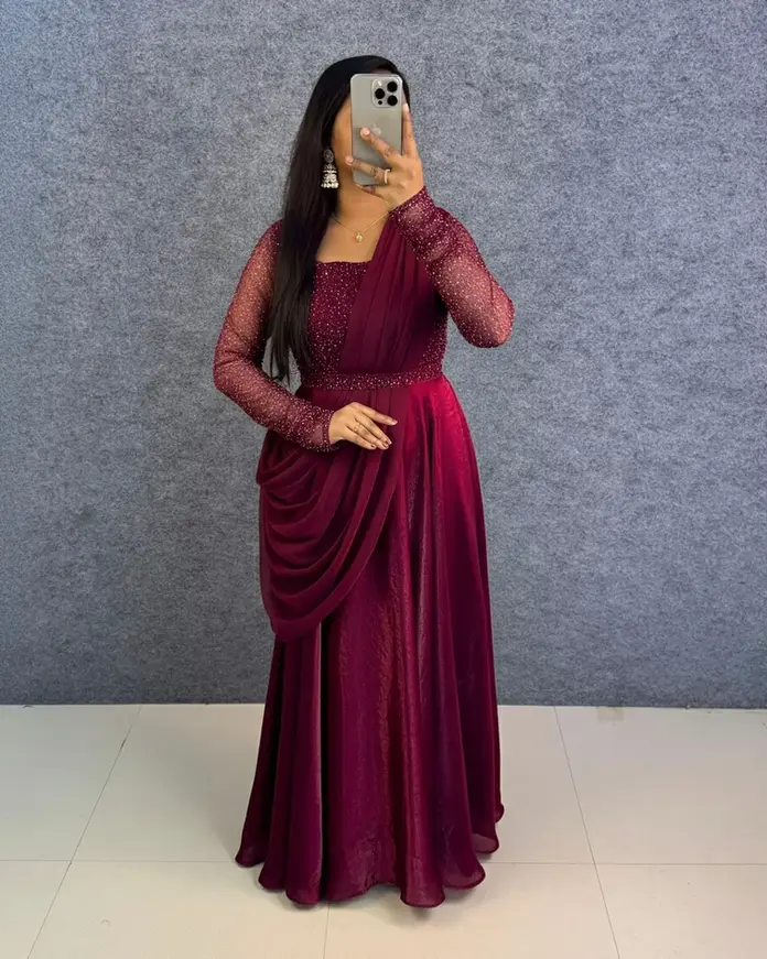 Space Silk Beads work Gown+Duppata+Belt